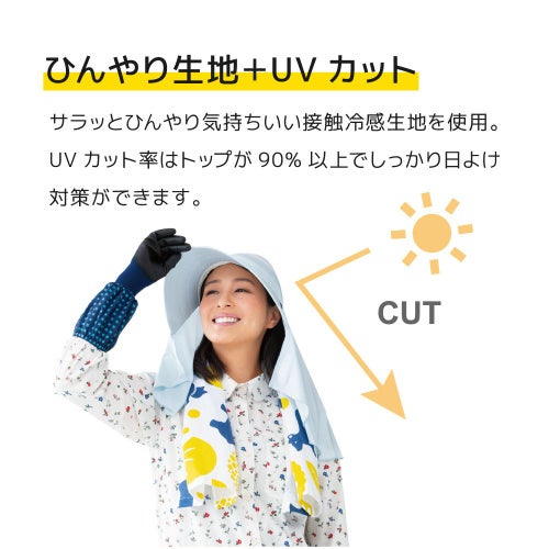 サラサラとしてひんやり気持ちいい、接触冷感生地の農帽です。ツバとタレが大きく、UVカット率もトップは90%以上でしっかり日よけをすることができます。
