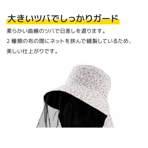 上品なシルエットの防虫ネット付き農園フードです。長めのネットで虫の侵入を防ぎ、大きなツバで日差しから顔を守ります。