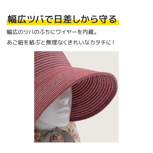 幅広のツバのふちにワイヤーを内蔵。あご紐を結ぶと無理なくきれいなカタチに。日差しからあなたを守ってくれます。