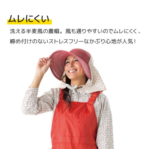 帽子部分を洗える素材にした、半麦風の農帽です。気分も華やぐレッドと柄生地の組み合わせが可愛いアイテム◎
