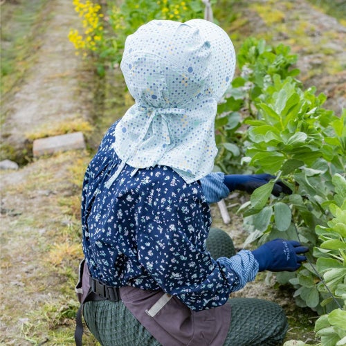 「作業していると左右にズレるのが気になる」という声からできた、フィット感を重視したフードタイプの農帽です。