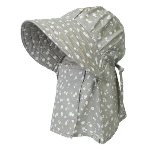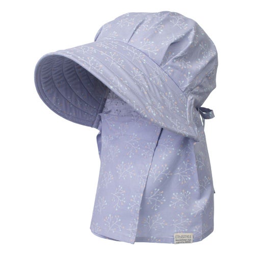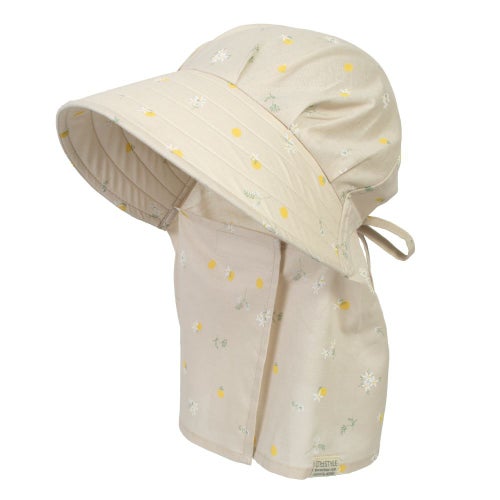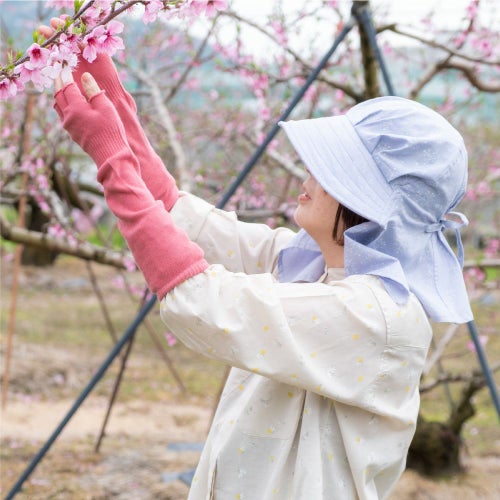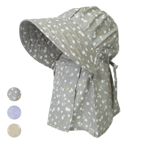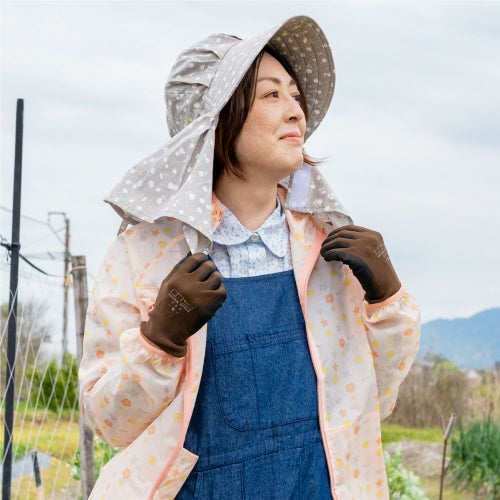 後頭部に内蔵のゴムが程よくフィットして、ズレを解消。今までのフードタイプとかぶり心地が断然違います。※画像は柄違いの「農園フード ラブリー/山桜」です。