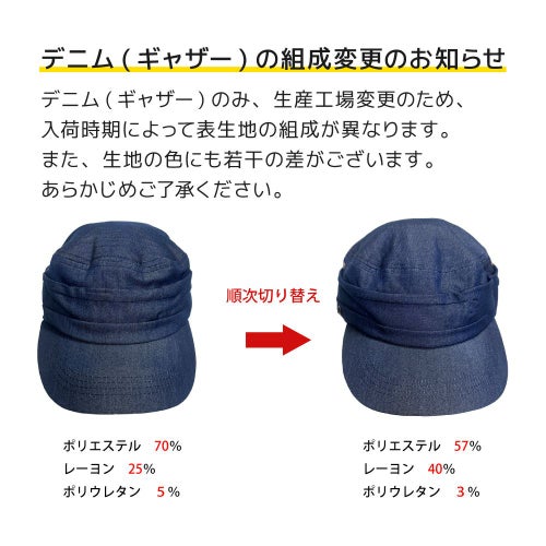 素材 デニム(ギャザー)表地:ポリエステル70%、レーヨン25%、ポリウレタン5%(生産工場変更のためポリエステル57%、レーヨン40%、ポリウレタン3%に順次切り替え)