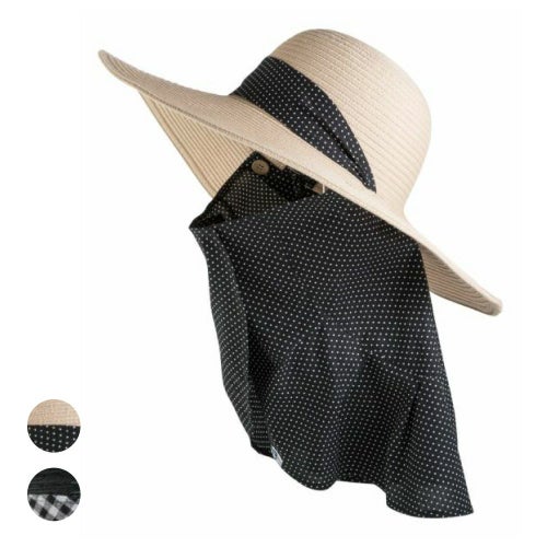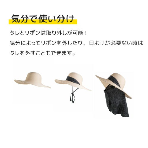 日よけタレはUVカット率90%以上で日よけ対策もばっちり! 日よけタレとリボン兼あご紐は取り外しもできます。