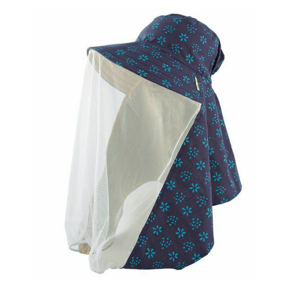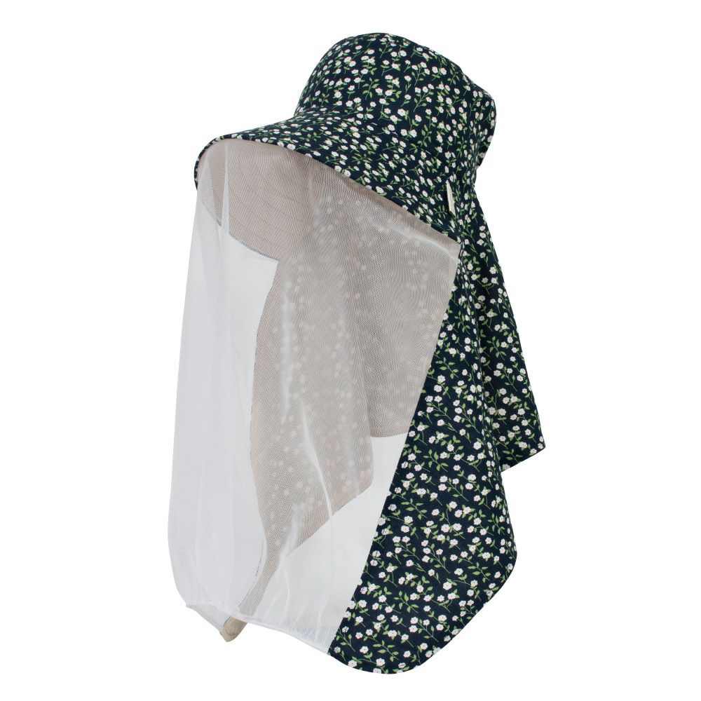 上品なシルエットの防虫ネット付き農園フードです。長めのネットで虫の侵入を防ぎ、大きなツバで日差しから顔を守ります。