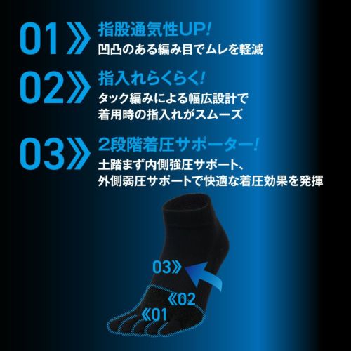 土踏まず内側強圧サポート、外側弱圧サポートで快適な着圧効果を発揮