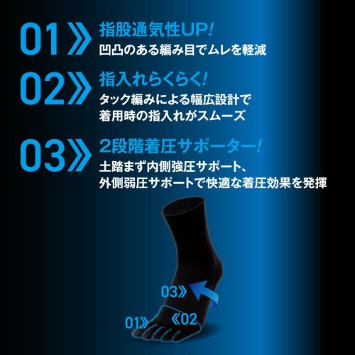 土踏まず内側強圧サポート、外側弱圧サポートで快適な着圧効果を発揮