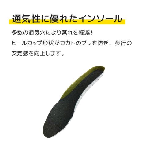 ハイクッションソール 高さ約40mm(かかと部分)のソールが足への衝撃を吸収して足への負担を軽減。 軽量 片足の重量は約315g(26.0cm)と軽量。 耐衝撃・耐圧迫性能 つま先部の耐衝撃性能・耐圧迫性能でつま先を守ります。 JIS T8101(L種)基準値相当。 ヒールカップインソール 多数の通気穴によりムレを軽減。 ヒールカップ形状がかかとのブレを防ぎ、歩行の安定感を向上します。