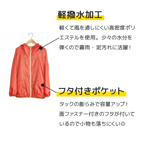軽くて風を通しにくい高密度ポリエステルを使用!軽撥水加工で、少々の水や霧雨・泥汚れに活躍します。