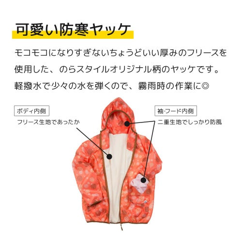ボディ部分の内側をフリース生地で温かくし、袖とフード部分は二重生地でしっかり防風できます。