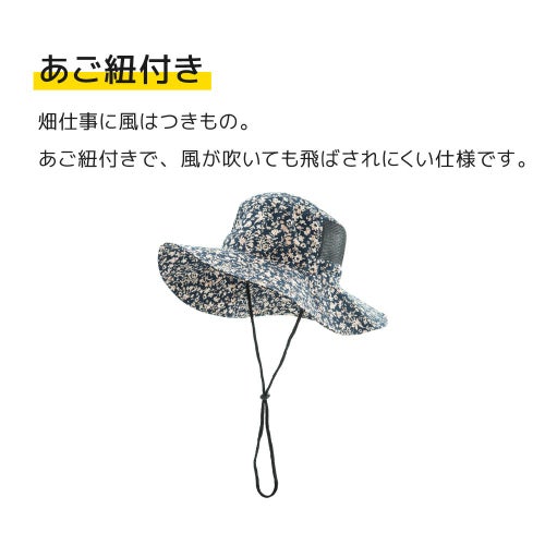 畑仕事に風はつきもの。風によって飛ばされないようあご紐付きです。