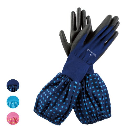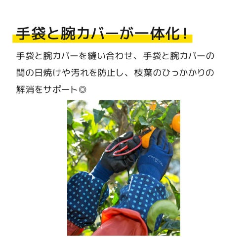 手袋に腕カバーを縫い合わせることによって手袋と腕カバーの間の日焼けや汚れを防止し、枝葉のひっかかりの解消をサポート◎