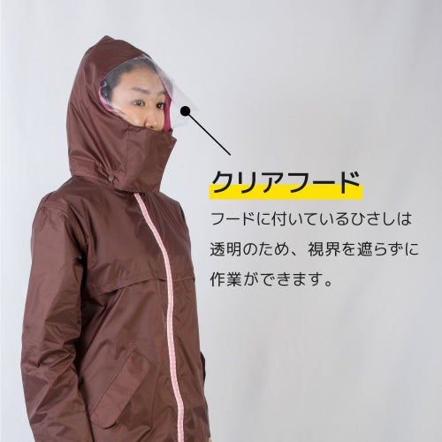 全身4か所からムレを逃がすベンチレーション(風通し)、雨や汚れが入りにくい二重袖、視界を遮らない透明ひさしのフードと機能充実◎
