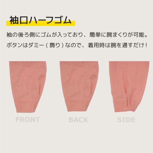 前から見るとカフス、後ろ側はゴムの袖口。そのまま袖を引き上げると袖口後ろのゴムが伸び、好きな位置で腕まくりできます。総ゴムの袖口と違って腕を締めつけず、優しい肌あたり。ボタンはダミー(飾り)なので、着用時もサッと腕を通すだけ。