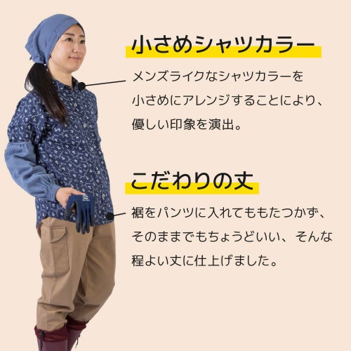 「裾をパンツに入れて、もたつかない程よい丈」など、ワークシャツの女性らしさにこだわりました。