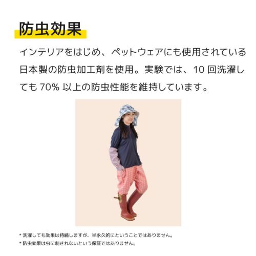 インテリアをはじめ、ペットウェアにも用いられている安全・安心な日本製の防虫加工剤を使用。実験では、10回洗濯しても70%以上の防虫性能を維持しています。