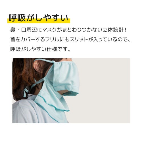 鼻・口周辺にマスクがまとわりつかない立体設計で、首をカバーするフリルにもスリットが入っているので自然な呼吸でいられます。