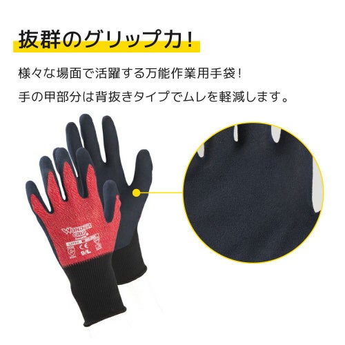 抜群のグリップ力で様々な場面で活躍する万能作業用手袋。しっかり手にフィットし、作業効率もアップ!手の甲部分は背抜きタイプで通気性もあり、ムレを軽減してくれる。