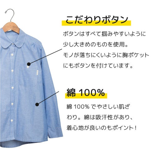 掴みやすい大きめボタン、簡単に袖まくりができる袖口ハーフゴム、ボタン付き胸ポケットなど機能性に優れたブラウス。