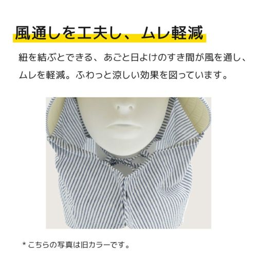 紐を結ぶと出来るあごと日よけのすき間がムレをやわらげ、ふわっと涼しい効果を図っています。