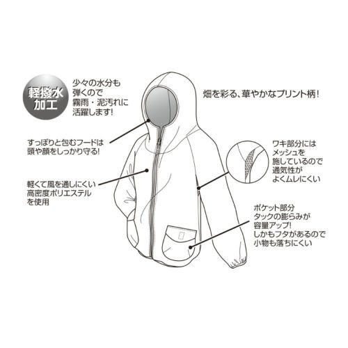 軽撥水加工で少々の水や霧雨・泥汚れを弾くフルジップヤッケです。