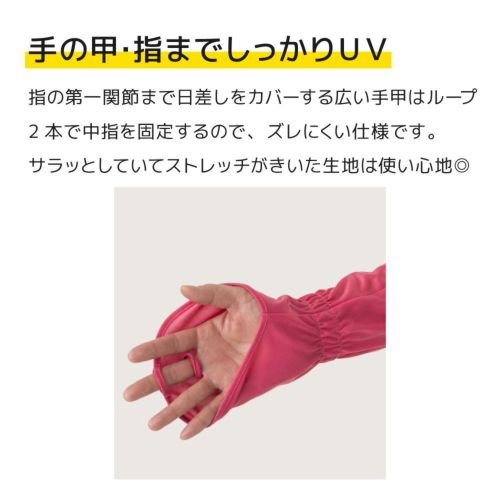 指の第一関節まで日差しをカバーする広い手甲は、ループ2本で中指を固定するので、ずれにくくしっかりカバーします。
