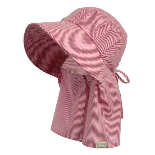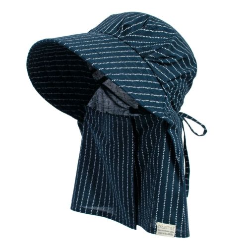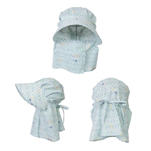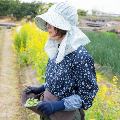 後頭部に内蔵のゴムが程よくフィットして、ズレを解消。今までのフードタイプとかぶり心地が断然違います。※画像は柄違いの「農園フード ラブリー/山桜」です。