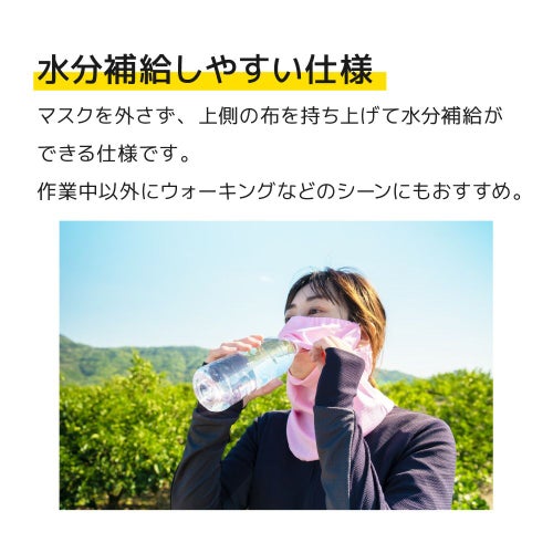 マスクを外さなくても、上側の布を持ち上げて水分補給ができる仕様になっていて、作業中だけでなく、ウォーキングなど普段使いにも最適です!
