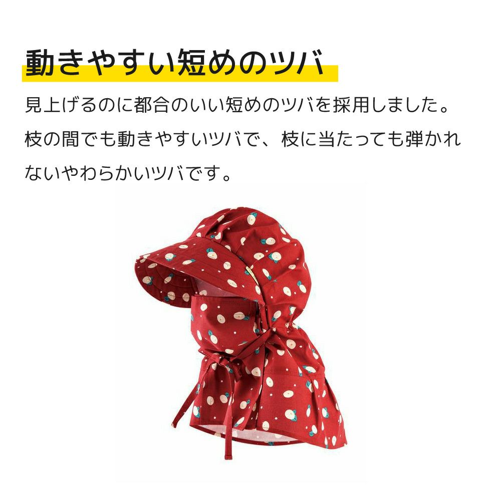 見上げるのに都合のいい短めのツバ。枝の間でも動きやすい小ぶりなツバ。枝にあたっても弾かれない柔らかいツバ。果樹農家さんの悩みを解決するための工夫です。