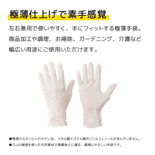 100枚入りの大容量!左右兼用なので使いやすく、手にぴったりフィットする極薄仕上げにより、素手感覚で使用できます。